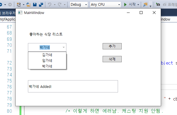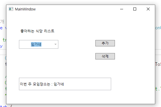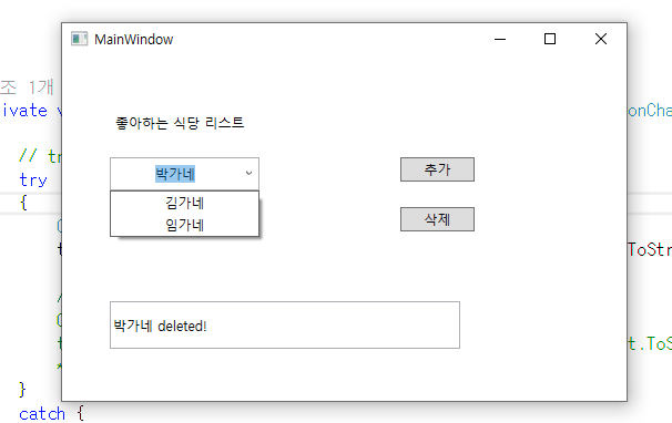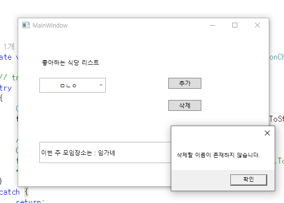 콤보박스 Text입력 란에 음식점 이름 입력 후 추가 누르면 콤보박스 리스트 item에 추가가 되고, 삭제를 누르면 해당 item이 리스트에서 삭제된다. 만약 리스트 item에 없는 음식점 이름을 삭제하면 삭제할 이름이 존재하지 않는다 라는 메시지박스가 뜬다.