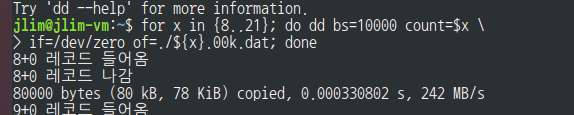 jlim@jlim-vm:~/temp0$ for i in {8..21}; do dd bs=100000 count=$i \