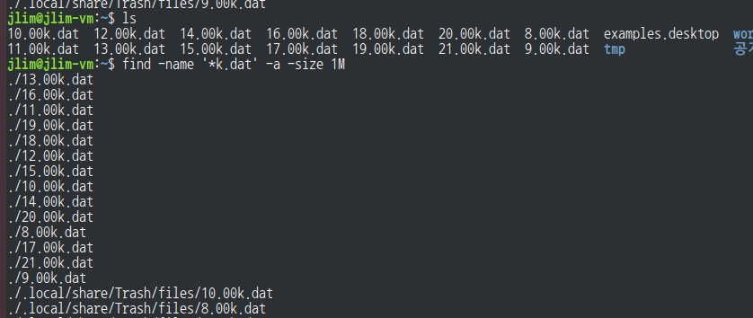 jlim@jlim-vm:~/temp0$ find . -name '*k.dat' -a –size 1M