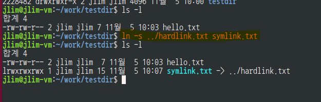 lrwxrwxrwx 1 jlim jlim 15 11월 5 10:07 symlink.txt -> ../hardlink.txt