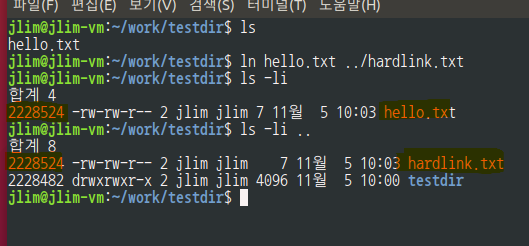 jlim@jlim-vm:~/work/testdir$ ln hello.txt ../hardlink.txt