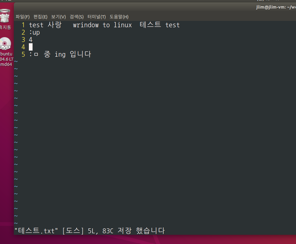 윈도우에 텍스트 파일을 리눅스에 가져온다. 그리고 vimrc에서 set 한글변환설정 주석처리 한다.