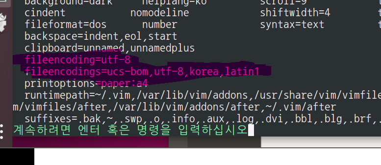 단, fileencodings에선 ucs-bom,utf-8,korea,latin1 통해 vim 에디터에서 문자열이 깨지지 않음을 알 수 있다.