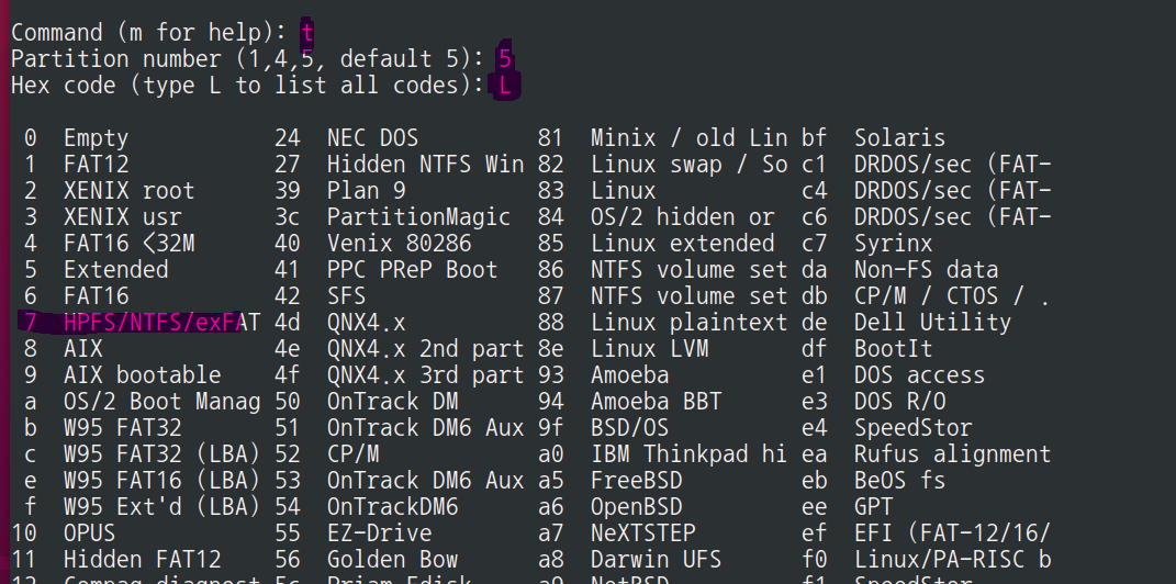L 입력통해 파티션 ID 타입 확인하여 7번을 선택했다.