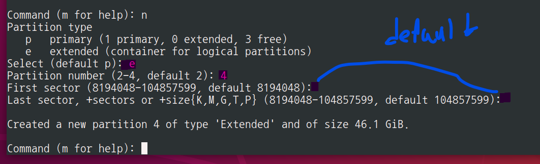파티션 넘버는 1에 주파티션을 할당했으니, 2~4 중 하나이지만, 관례적으로 extended 는 4번이다.