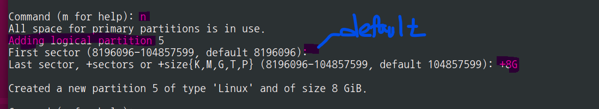 first는 맨 처음 위치이고 Last sector에서 defalut는 끝위치로 첫번째와 두번쨰가 default 므로 전체가 다 할당됨