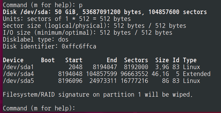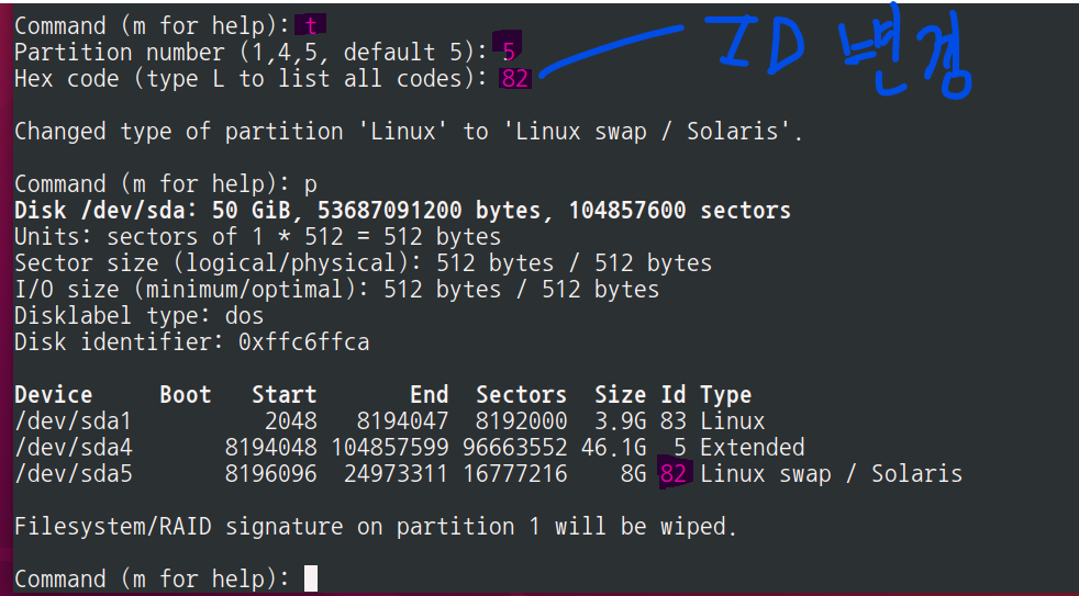 sda5 파티션 ID가 83 -> 82(리눅스 스왑) 으로 변경됨