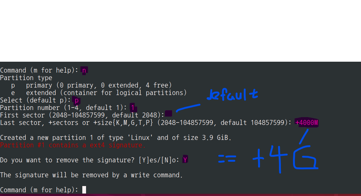 섹터가 2048 ~4000 M 를 가진 주 파티션1 을 생성하는 과정을 보고 있다.