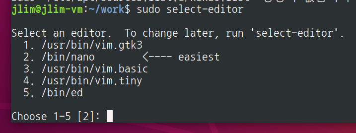 원하는 에디터를 설정한다. 필자는 3 번 vim 으로 설정함.