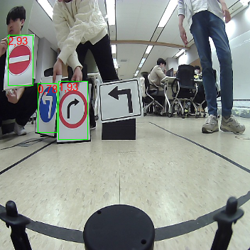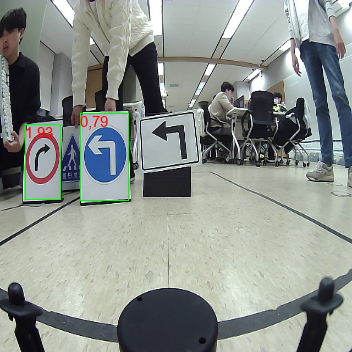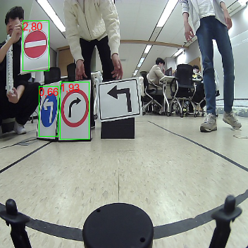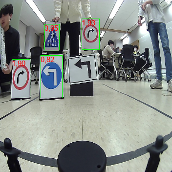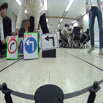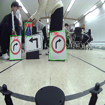 하기 결과 사진은 자이카가 아닌, Labtop에서 나온 결과로 첫번째 숫자는 클래스 넘버입니다. 좌측 표지판이 두 종류가 있는데 검정 표지판은 마스킹 처리를 통해 detection에서 배제했습니다. 자이카에서는 PIL라이브러리를 통해 left,right,crosswalk 등 이름을 시각화했습니다만, 아쉽게도 사진으로 못 남겼습니다.