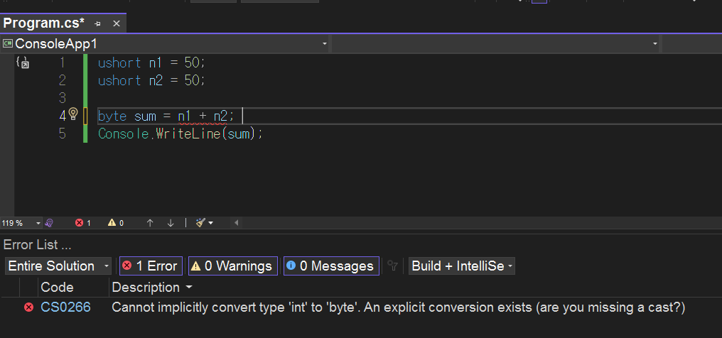 이유는 왼쪽 sum의 타입이 오른쪽 변수들의 타입보다 작기 때문이다. 이때는 오른쪽 값의 캐스팅 진행해야한다.