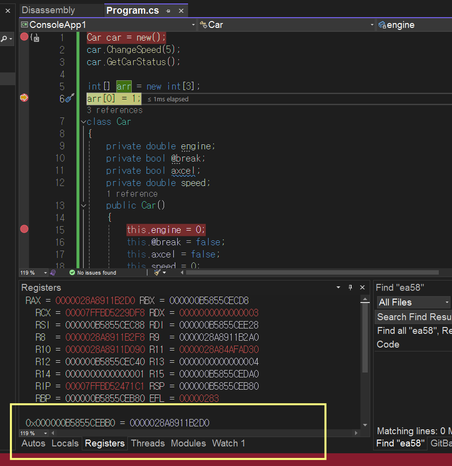 레지스터 기능 통해 클래스 멤버들을 참조하여 접근하는 것을 확인 할 수 있다.