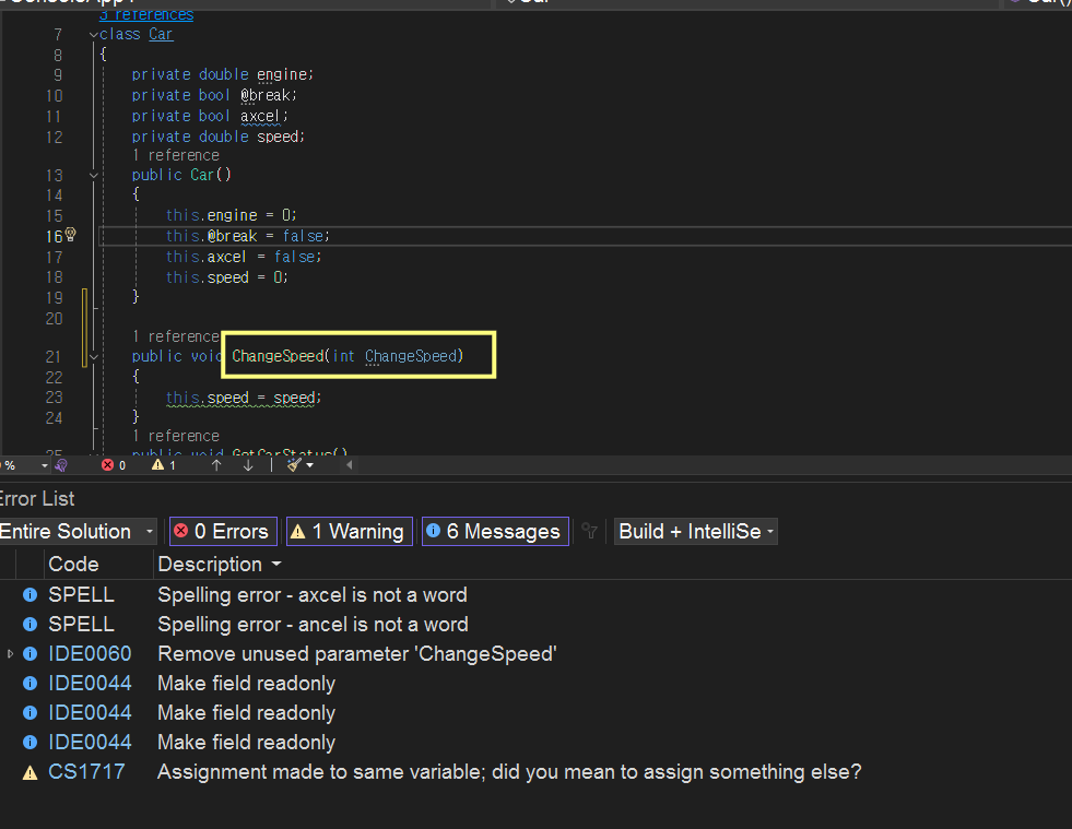 매개변수 명과 메서드명은 각각 식별자에 해당하여 사용자가 임의의 이름을 정할 수 있으며 위처럼 컴파일 경고가 있지만, 동일한 명을 허용하기도 한다. 실무에서는 이러면 안된다.