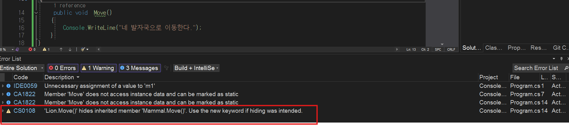 컴파일 경고가 뜬 이유: 부모 클래스에서 Move라는 이름의 메서드를 정의했다 하여 자식 클래스에서 그것과 동일한 이름을 사용하기 위해 반드시 virtual/override를 붙일필요는 없다.