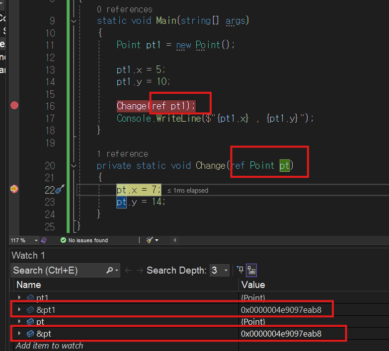 Change2(ref pt1); // ref 사용