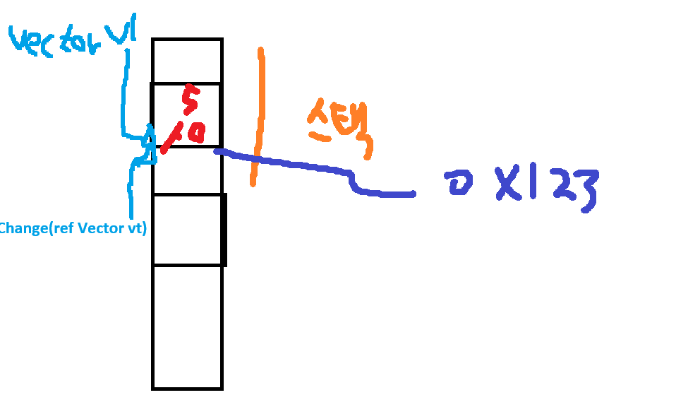 ref를 사용 하지 않았을때는 값 형식의 스택 복사가 있었지만, ref를 사용하게 되면 메서드의 vt 변수가 호출 측의 v1변수와 동일한 주소를 가리키게 된다.