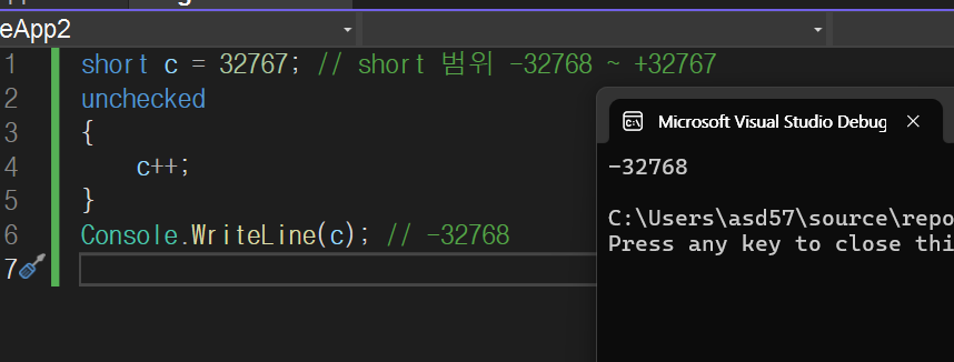 Console.WriteLine(c); // -32768