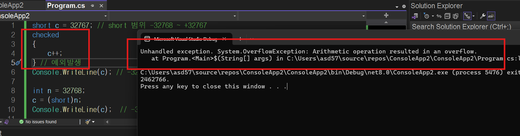 C#에서는 checked 예약어를 통해 연산식에서 오버플로가 발생한 경우 오류(예외)를 발생시킬 수 있다.