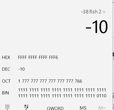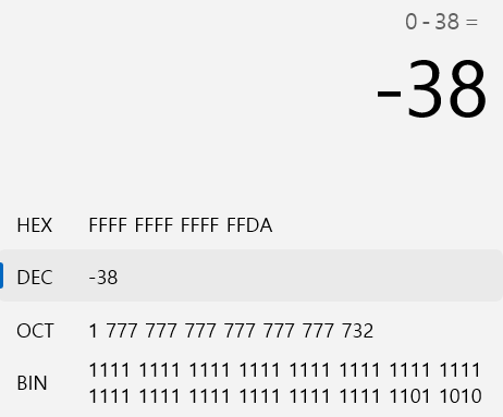 우측 시프트 연산에서 주의할 사안은 최상위 비트(MSB: most significant bit)가 부호의 유무에 따라 처리 방식이 달라진다는 점이다. 예를 들어 -38이 부호 있는 32비트 정수 타입에 담겨있을 때를 보자.