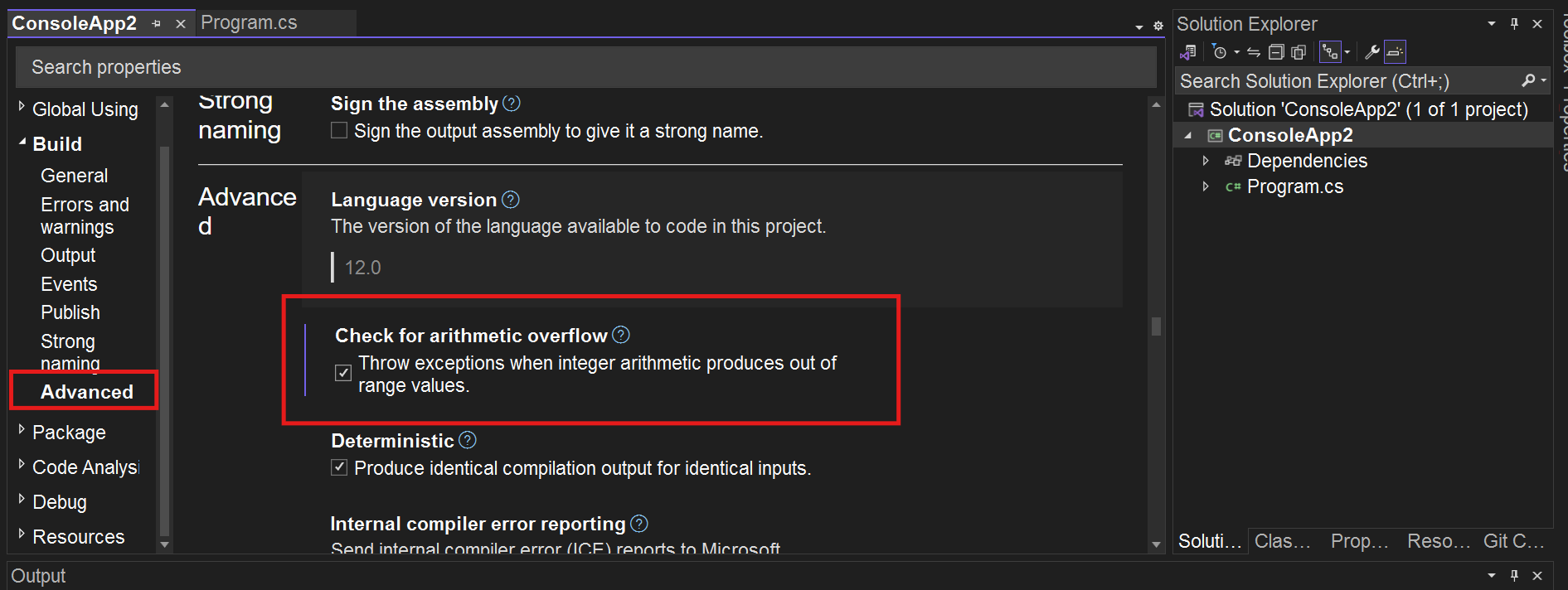 경우에 따라 checked 예약어의 명시적인 사용은 개발자로 하여금 실수할 수 있는 여지를 남긴다. 이 때문에 C#은 컴파일러 수준에서 checked 상황을 전체 소스코드에 걸쳐 강제로 적용할 수 있는 '산술 오버플로 확인(Check for arthmetic overflow)' 옵션을 제공한다.
