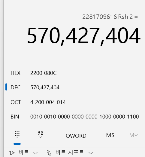 반면 숫자 2281709616을 부호 없는 32비트 정수타입에 담아 시프트 연산을 하면 처리결과가 달라진다.