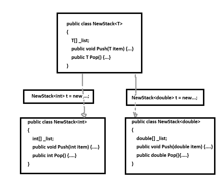 상기 코드 빌드하고 실행하면 CLR은 JIT 컴파일 시에 클래스가 타입에 따라 정의될 때마다 T에 대응되는 타입을 대체해서 확장한다. NewStack<T>에 int, double을 전달한 코드 사용 시 아래와 같이 2개의 클래스에 해당하는 기계어 코드가 자동으로 만들어진다.