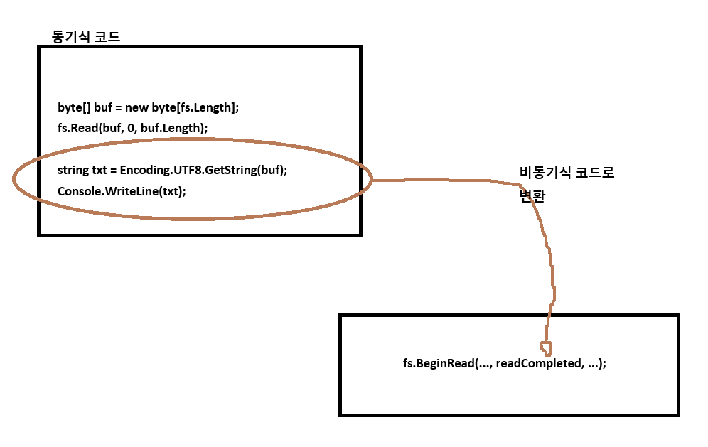 동기와 비동기 코드를 보면 동기에서 비동기로 바꿀 시 Read 호출 이후의 코드를 BeginRead에 전달하는 것으로 해결된다.