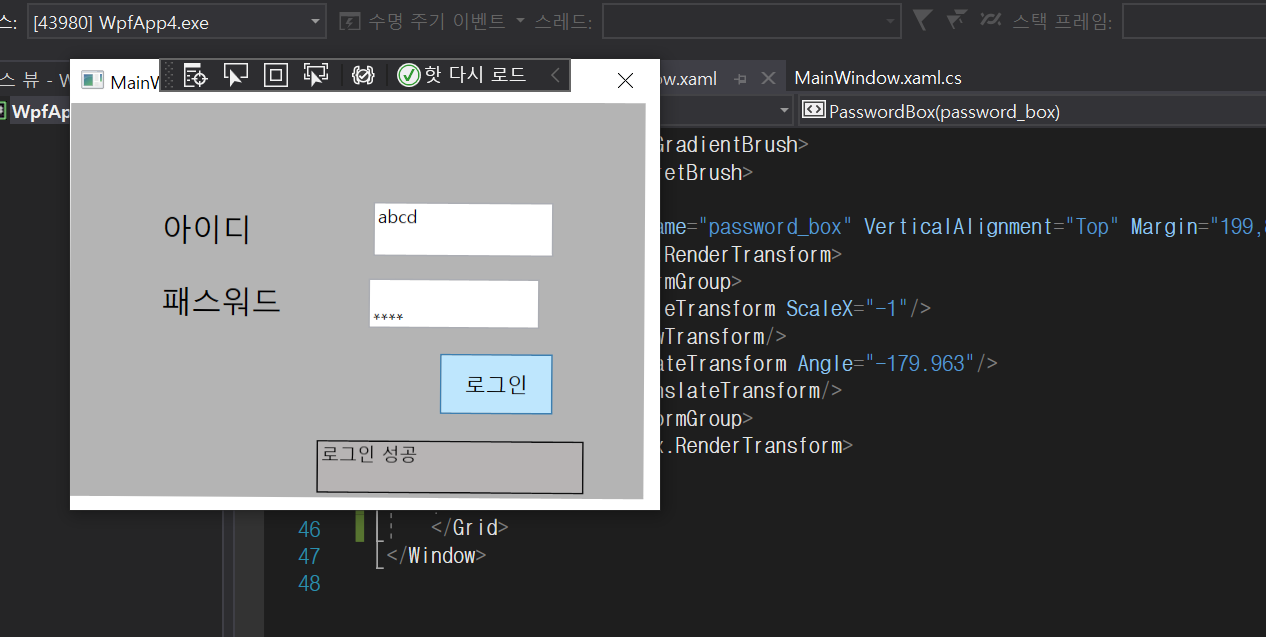 <Button x:Name="login_bt" Content="로그인" HorizontalAlignment="Left" VerticalAlignment="Top" Width="75" Margin="247,131,0,0" Height="40" FontSize="14" Click="login_bt_Click" Grid.Row="2"/>